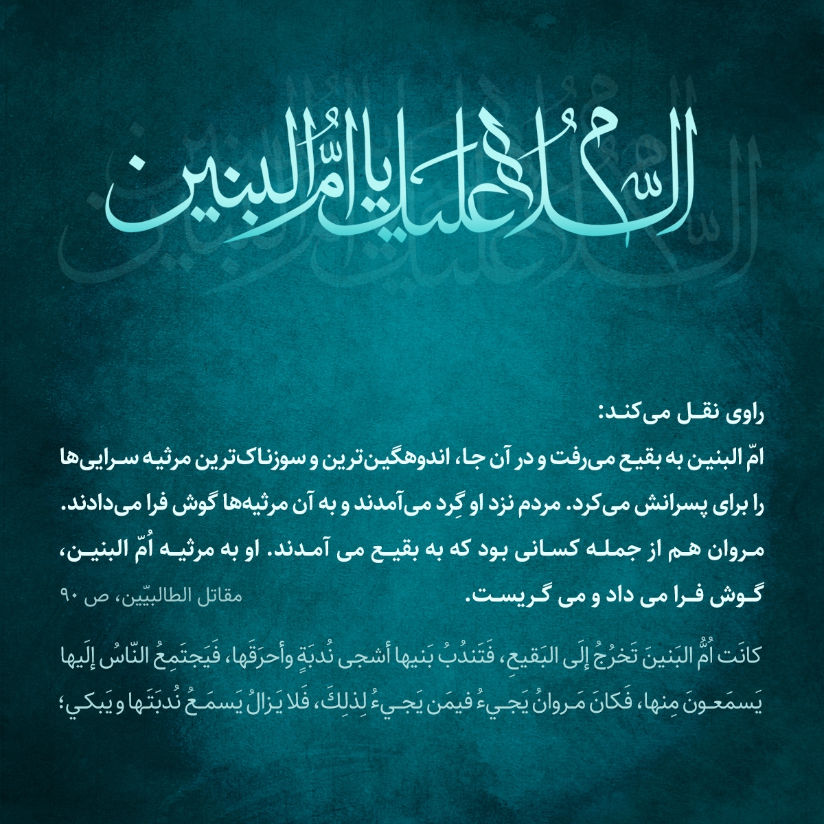 كانَت اُمُّ البَنينَ تَخرُجُ إلَى البَقيعِ، فَتَندُبُ بَنيها أشجى نُدبَةٍ وأحرَقَها، فَيَجتَمِعُ النّاسُ إلَيها يَسمَعونَ مِنها، فَكانَ مَروانُ يَجيءُ فيمَن يَجيءُ لِذلِكَ، فَلا يَزالُ يَسمَعُ نُدبَتَها ويَبكی؛