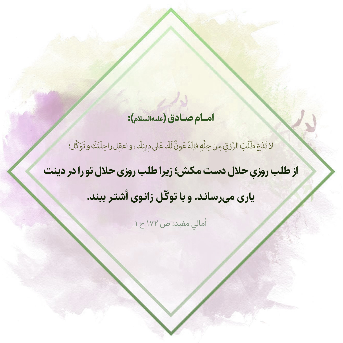 از طلب روزىِ حلال دست مكش؛ زيرا طلب روزى حلال تو را در دينت يارى مىرساند. و با توكّل زانوى اُشتر ببند.