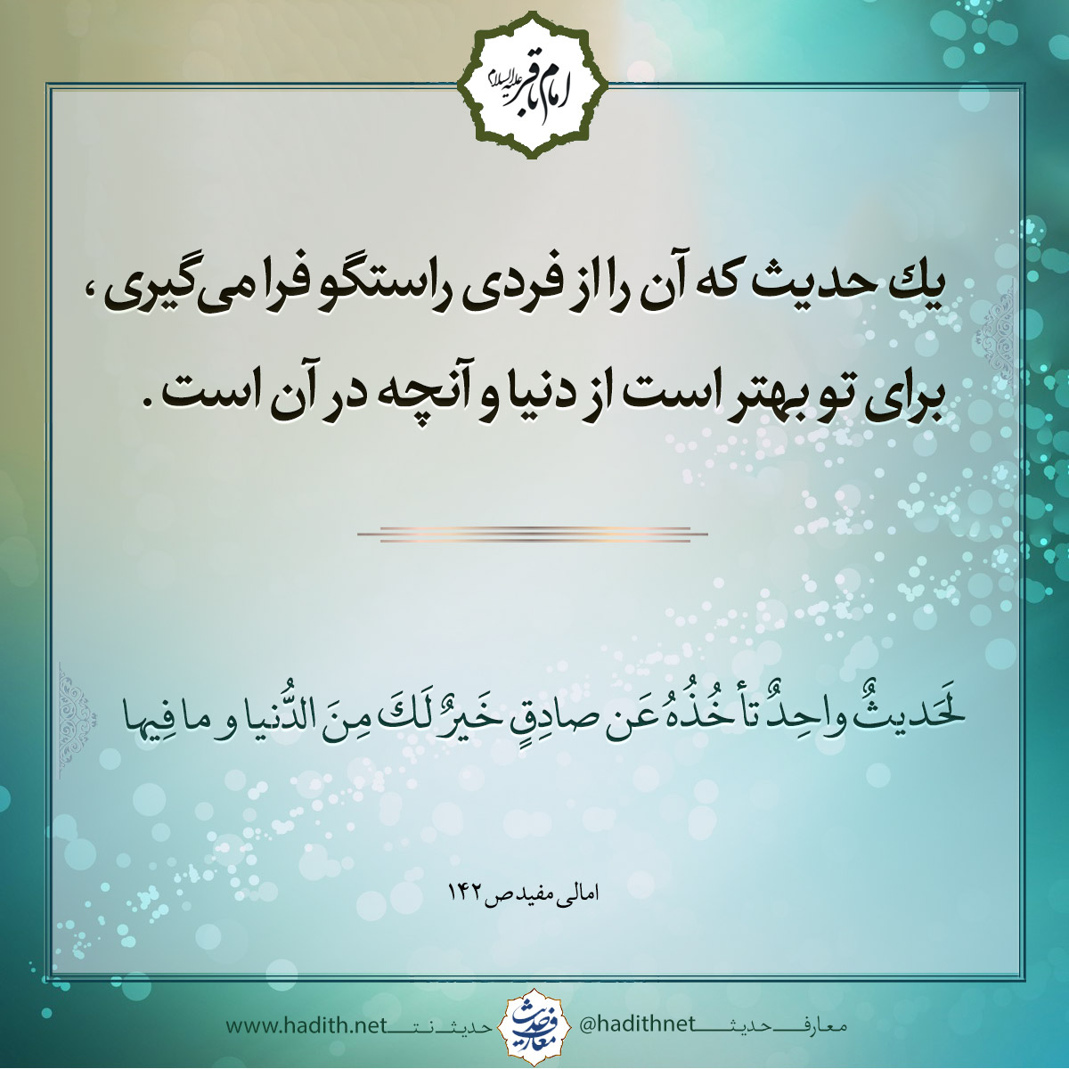يك حديث كه آن را از فردى راستگو فرا مى گيرى، براى تو بهتر است از دنيا و آنچه در آن است.