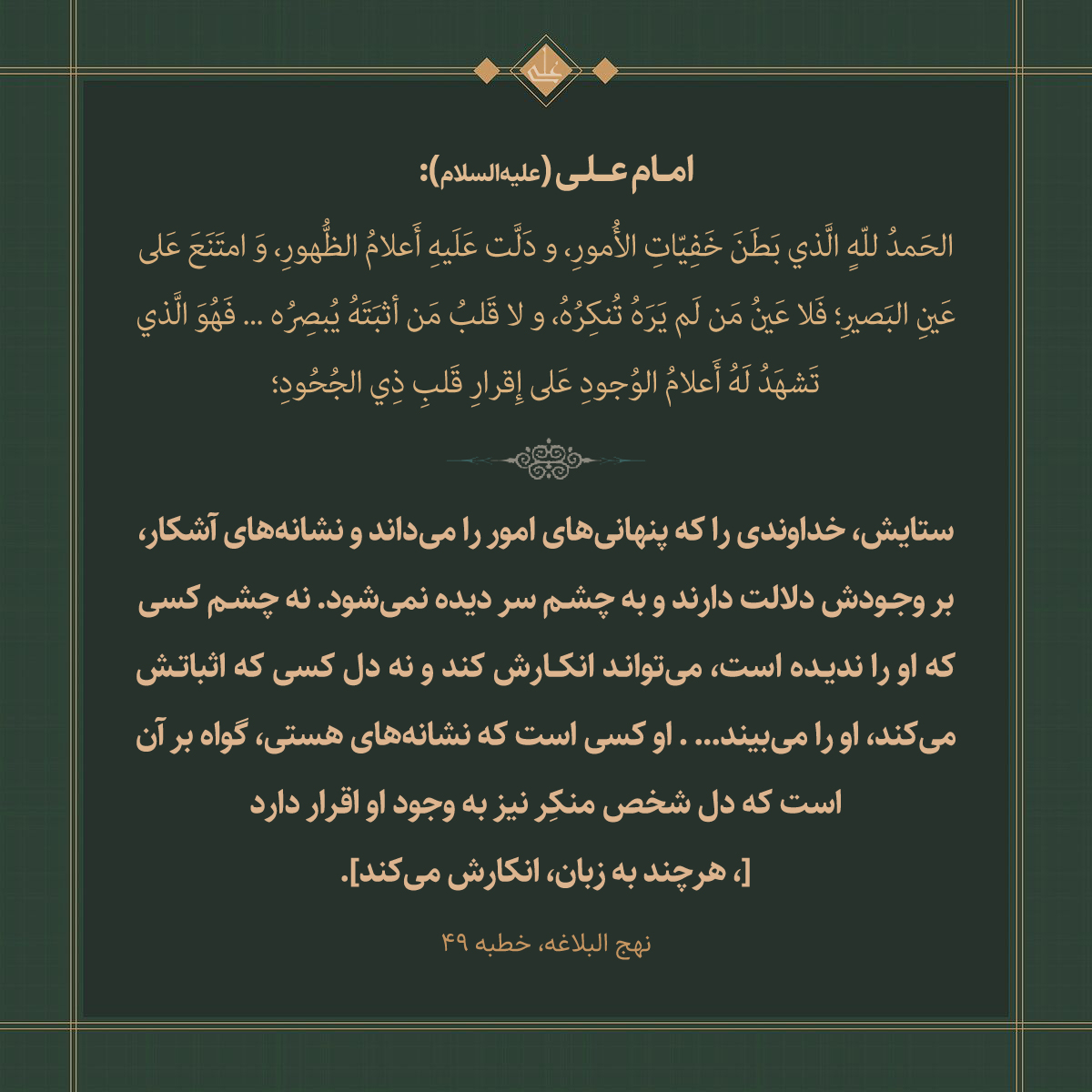ستايش، خداوندى را كه پنهانىهاى امور را مىداند و نشانههاى آشكار، بر وجودش دلالت دارند و به چشم سر ديده نمىشود. نه چشم كسى كه او را نديده است، مىتواند انكارش كند و نه دل كسى كه اثباتش مىكند، او را مىبيند... . او كسى است كه نشانههاى هستى، گواه بر آن است كه دل شخص منكِر نيز به وجود او اقرار دارد [، هرچند به زبان، انكارش مىكند].