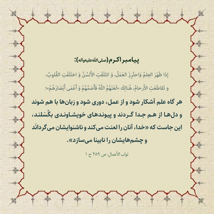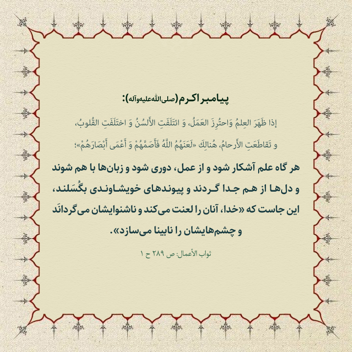 هر گاه علم آشكار شود و از عمل، دورى شود و زبانها با هم شوند و دلها از هم جدا گردند و پيوندهاى خويشاوندى بگُسَلند، اين جاست كه «خدا، آنان را لعنت مىكند و ناشنوايشان مىگردانَد و چشمهايشان را نابينا مىسازد.