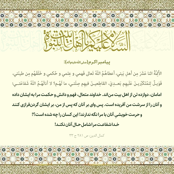 الأَئِمَّةُ اثنا عَشَرَ مِن أهلِ بَيتي، أعطاهُمُ اللّهُ تَعالى فَهمي و عِلمي و حُكمي و خَلَقَهُم مِن طينَتي ، فَوَيلٌ لِلمُتَكَبِّرينَ عَلَيهِم بَعدِيَ، القاطِعينَ فيهِم صِلَتي، ما لَهُم؟ لا أنالَهُمُ اللّهُ شَفاعَتي؛