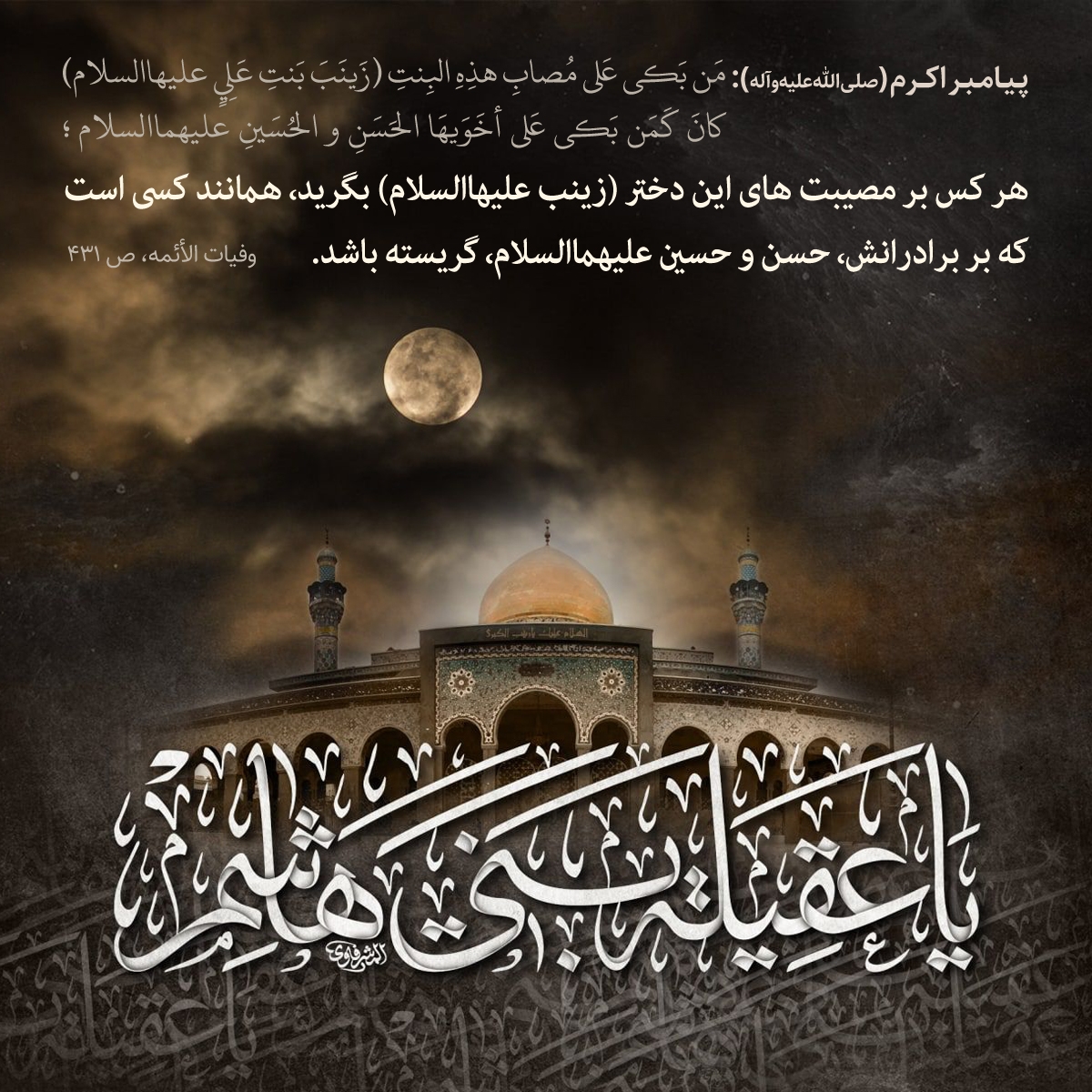 مَن بَكى عَلى مُصابِ هذِهِ البِنتِ (زَينَبَ بَنتِ عَلِيٍ عليهاالسلام) كانَ كَمَن بَكى عَلى أخَوَيهَا الحَسَنِ و الحُسَينِ عليهماالسلام؛
