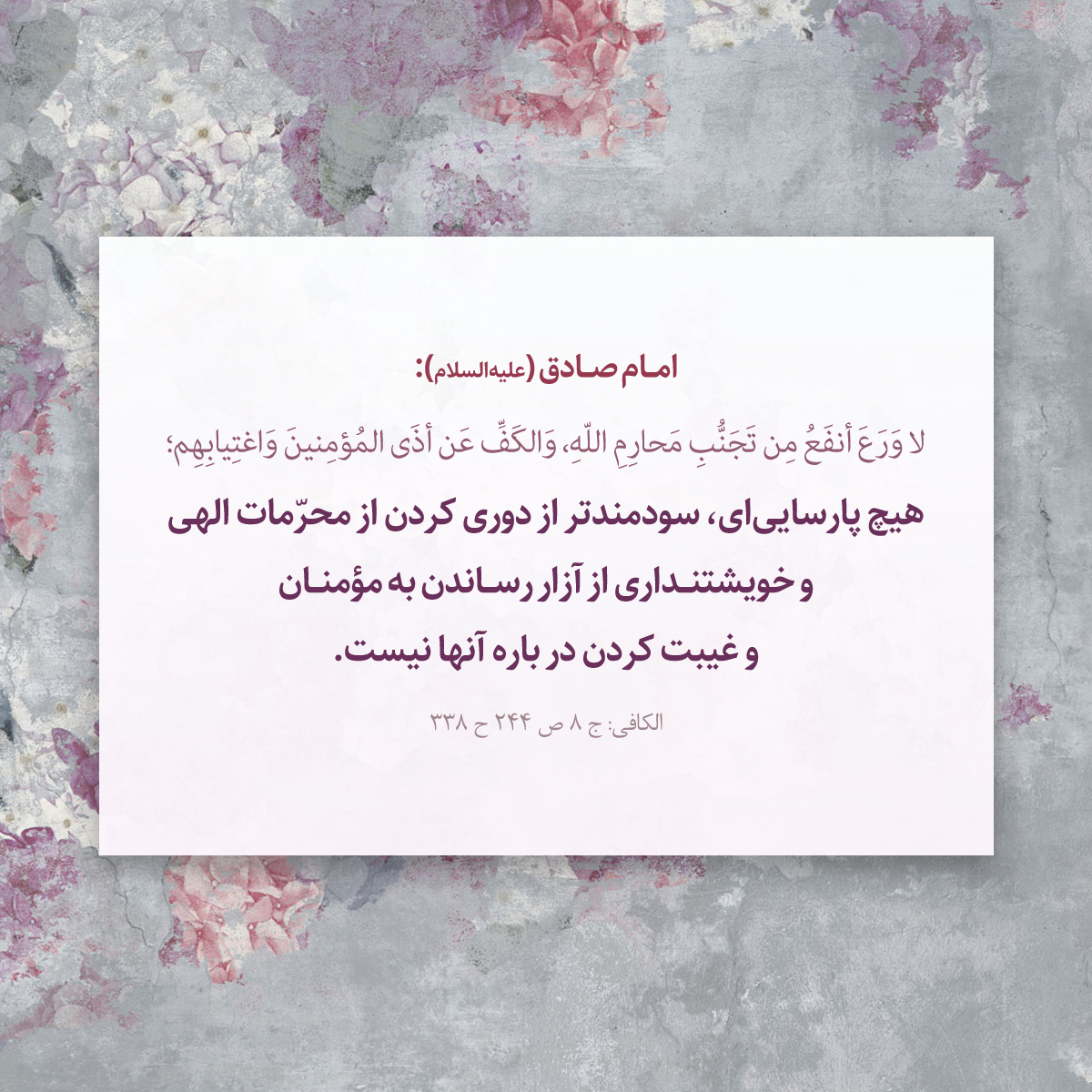 هيچ پارسايىاى، سودمندتر از دورى كردن از محرّمات الهى و خويشتندارى از آزار رساندن به مؤمنان و غيبت كردن در باره آنها نيست.