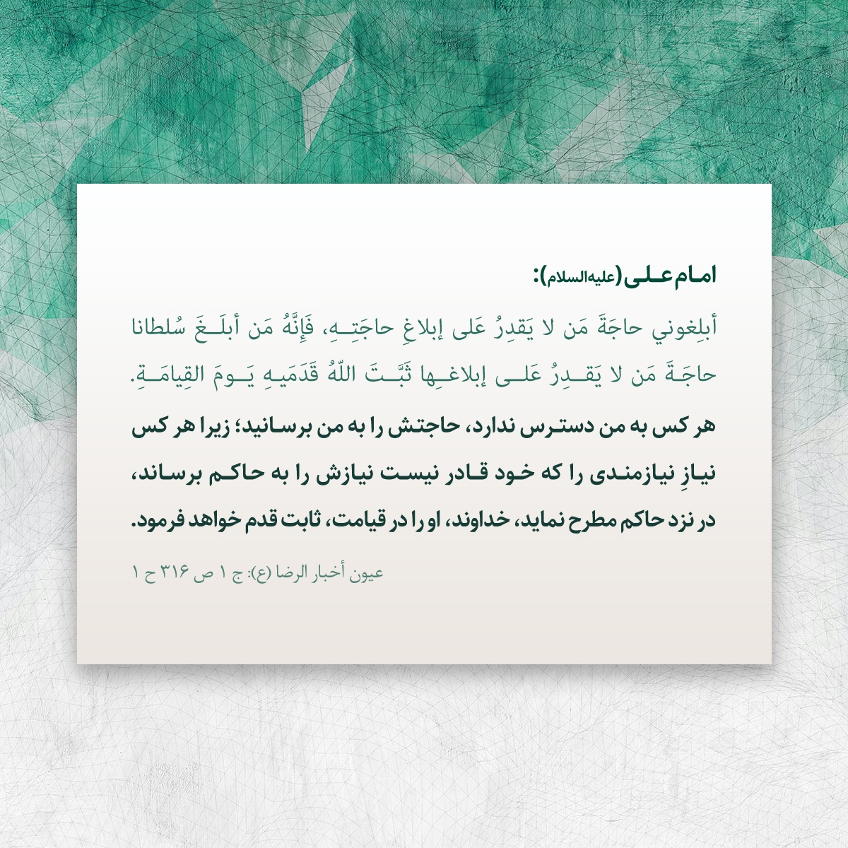 هر كس به من دسترس ندارد، حاجتش را به من برسانيد؛ زيرا هر كس نيازِ نيازمندى را كه خود قادر نيست نيازش را به حاكم برساند، در نزد حاكم مطرح نمايد، خداوند، او را در قيامت، ثابت قدم خواهد فرمود.