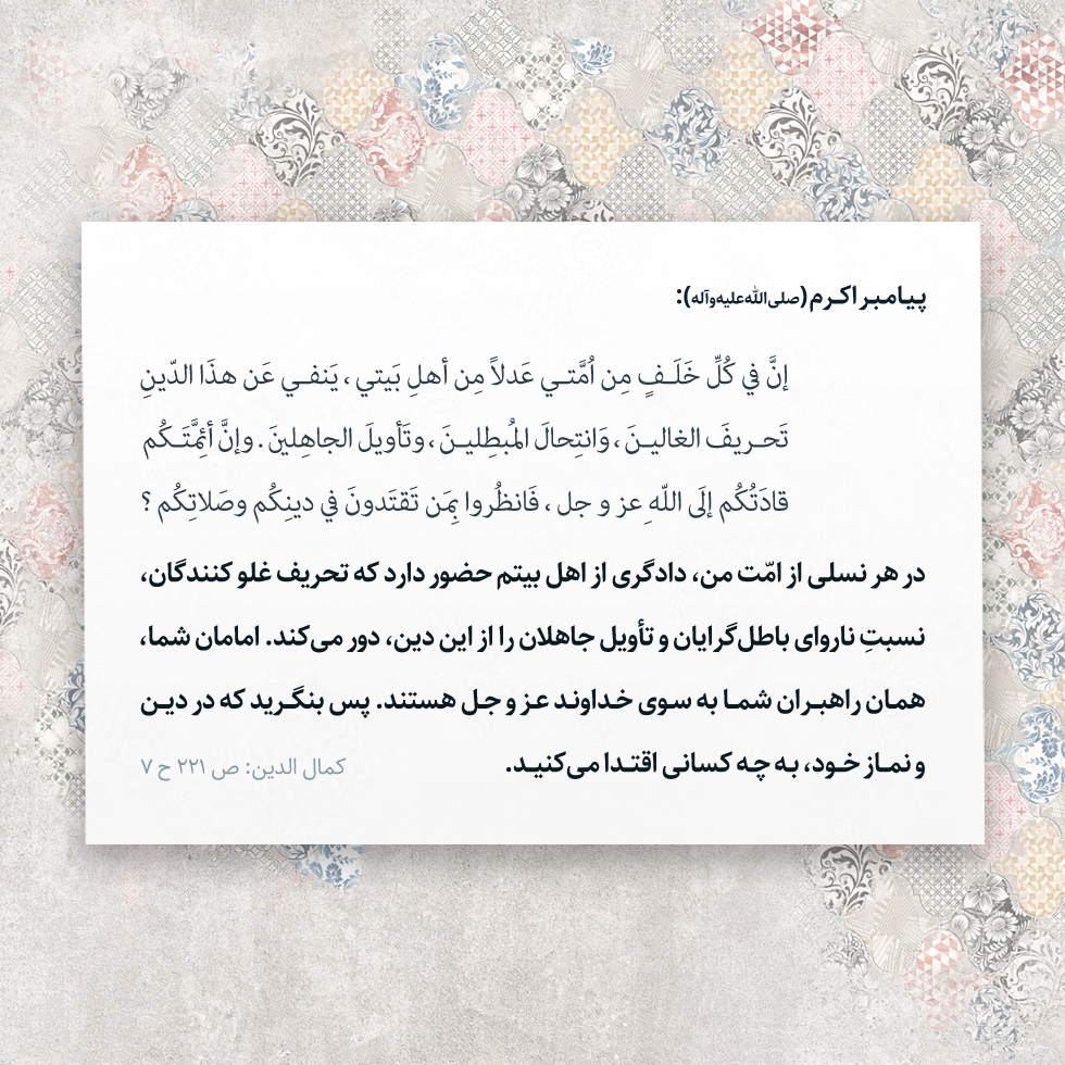 در هر نسلى از امّت من، دادگرى از اهل بيتم حضور دارد كه تحريف غلو كنندگان، نسبتِ نارواى باطلگرايان و تأويل جاهلان را از اين دين، دور مىكند. امامان شما، همان راهبران شما به سوى خداوند عز و جل هستند. پس بنگريد كه در دين و نماز خود، به چه كسانى اقتدا مىكنيد.