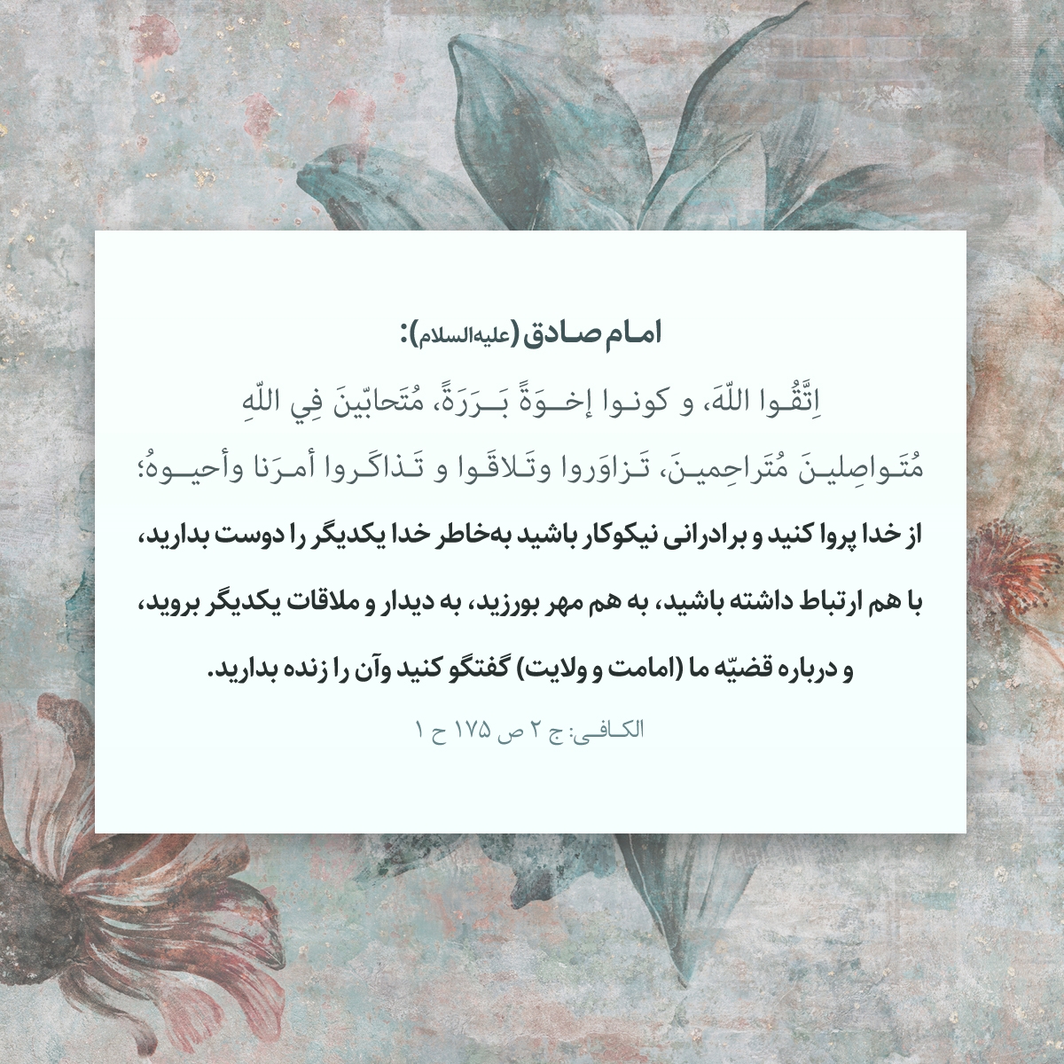 از خدا پروا كنيد و برادرانى نيكوكار باشيد بهخاطر خدا يكديگر را دوست بداريد، با هم ارتباط داشتهباشيد، به هم مهر بورزيد، به ديدار و ملاقات يكديگر برويد، و در باره قضيّه ما (امامت و ولايت) گفتگو كنيد وآن را زنده بداريد.