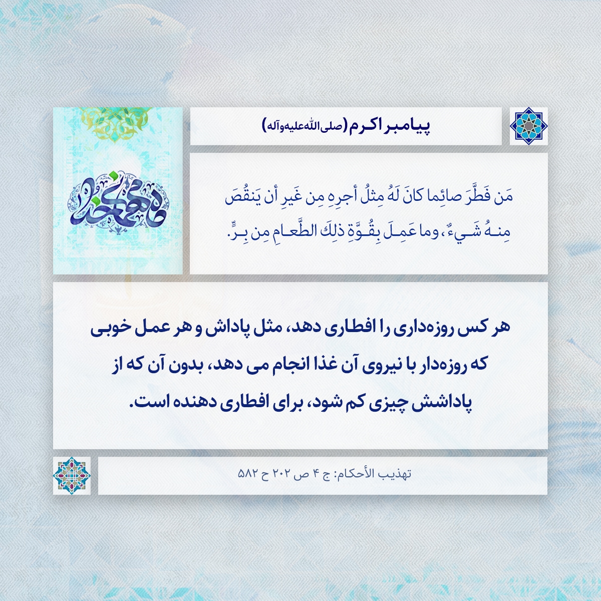 هر كس روزه دارى را افطارى دهد، مثل پاداش و هر عمل خوبى كه روزه دار با نيروى آن غذا انجام مى دهد، بدون آن كه از پاداشش چيزى كم شود، براى افطارى دهنده است.