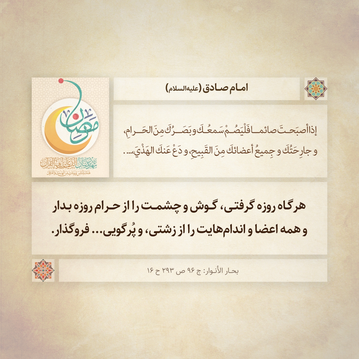 إذا أصبَحتَ صائما فَلْيَصُمْ سَمعُكَ و بَصَرُكَ مِنَ الحَرامِ، و جارِحَتُكَ و جِميعُ أعضائكَ مِنَ القَبِيحِ، و دَعْ عَنكَ الهَذْيَ،...؛