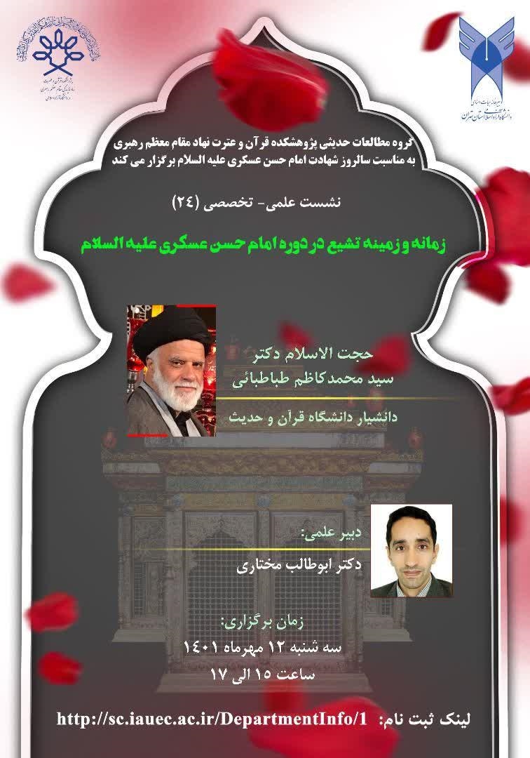 به مناسبت سالروز شهادت حضرت امام حسن عسکری علیه السلام، و به همت گروه مطالعات حدیثی پژوهشکده قرآن و عترت نهاد نمایندگی مقام معظم رهبری در دانشگاه آزاد اسلامی برگزار میشود.