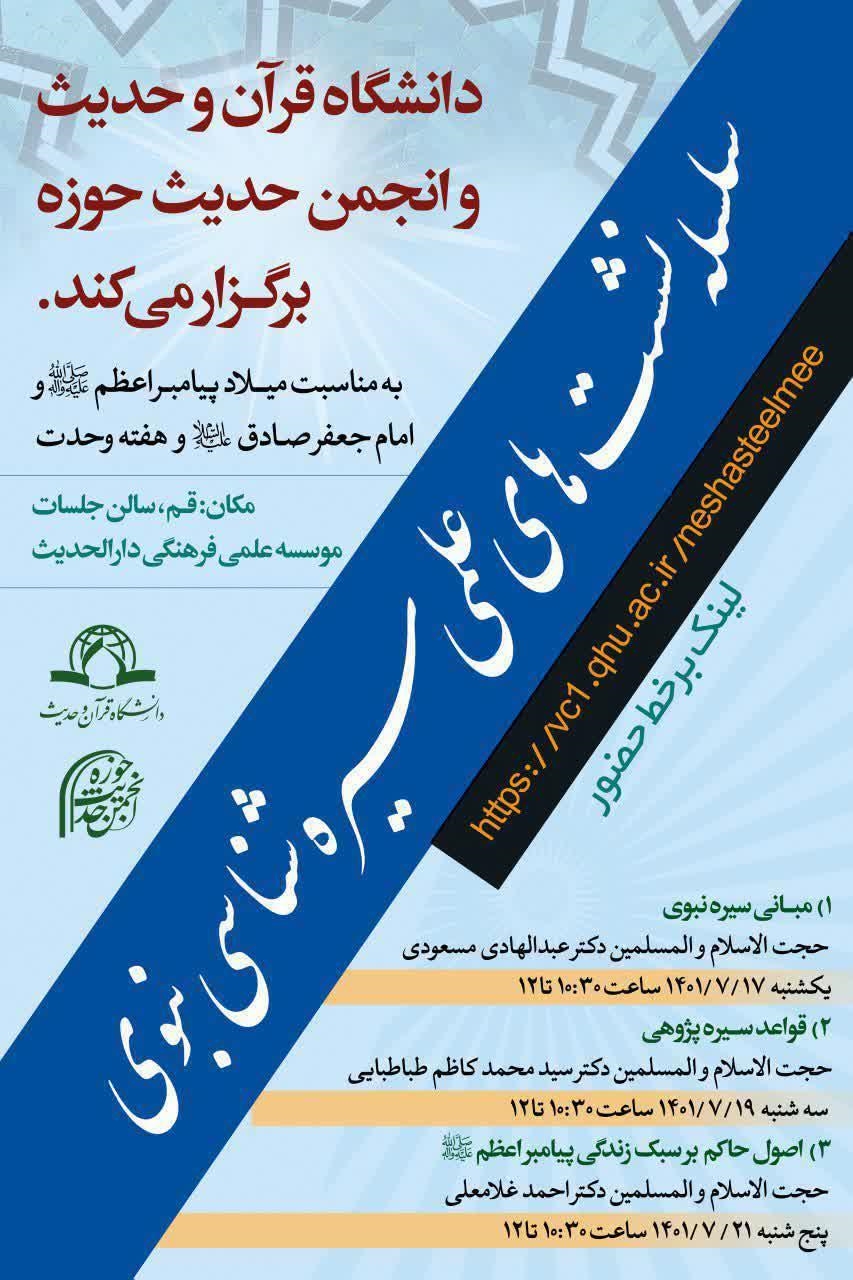 دانشگاه قرآن و حدیث و انجمن حدیث حوزه، به مناسبت میلاد پیامبر اعظم(ص) و امام جعفر صادق(ع) و هفته وحدت، سلسله نشست های علمی سیره شناسی نبوی را برگزار میکند.