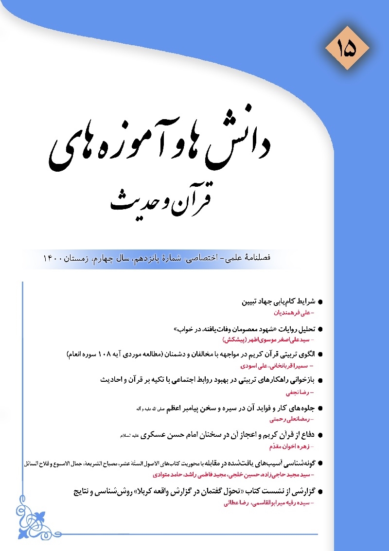 شرایط کامیابی جهاد تبیین، تحلیل روایات «شهود معصومان وفاتیافته، در خواب»، الگوی تربیتی قرآن کریم در مواجهه با مخالفان و دشمنان (مطالعه موردی آیه ۱۰۸ سوره انعام)، بازخوانی راهکارهای تربیتی در بهبود روابط اجتماعی با تکیه بر قرآن و احادیث، جلوههای کار و فواید آن در سیره و سخن پیامبر اعظم(ص)، دفاع از قرآن کریم و اعجاز آن در سخنان امام حسن عسکری(ع)، گونهشناسی آسیبهای یافت شده در مقابله با محوریت کتابهای الاصولالستّة عشر، مصباحالشریعة، جمالالاسبوع و فلاحالسائل و مقاله گزارشپروژه (گزارشی از نشست کتاب «تحول گفتمان در گزارش واقعه کربلا» روششناسی و نتایج)، عناوین مقالات این شماره از فصلنامه هستند.