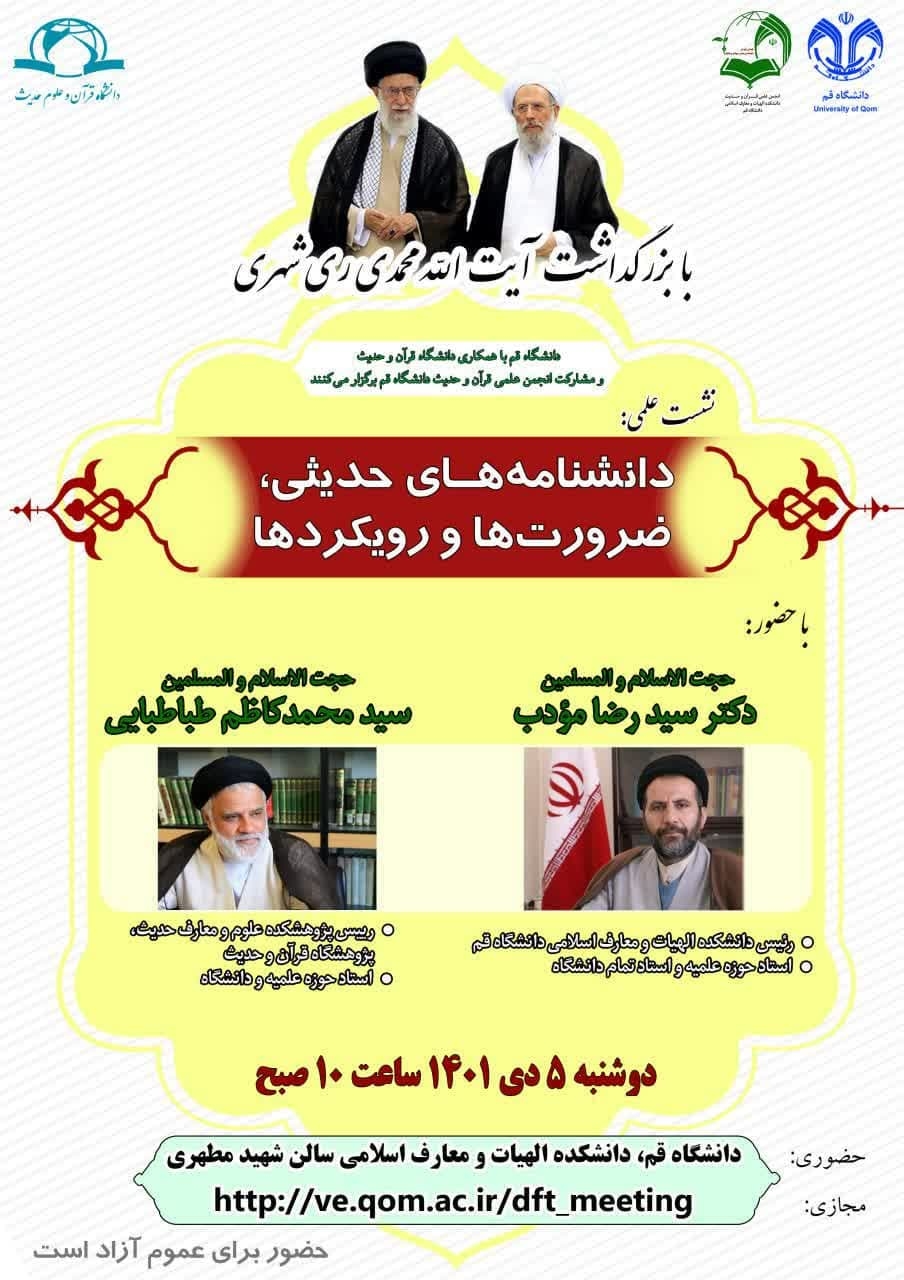دانشکده الهیات دانشگاه قم با همکاری دانشگاه قرآن و حدیث و مشارکت انجمن علمی قرآن و حدیث دانشگاه قم نشست علمی به همراه بزرگداشت آیت الله محمدی ریشهری، برگزار میکنند.