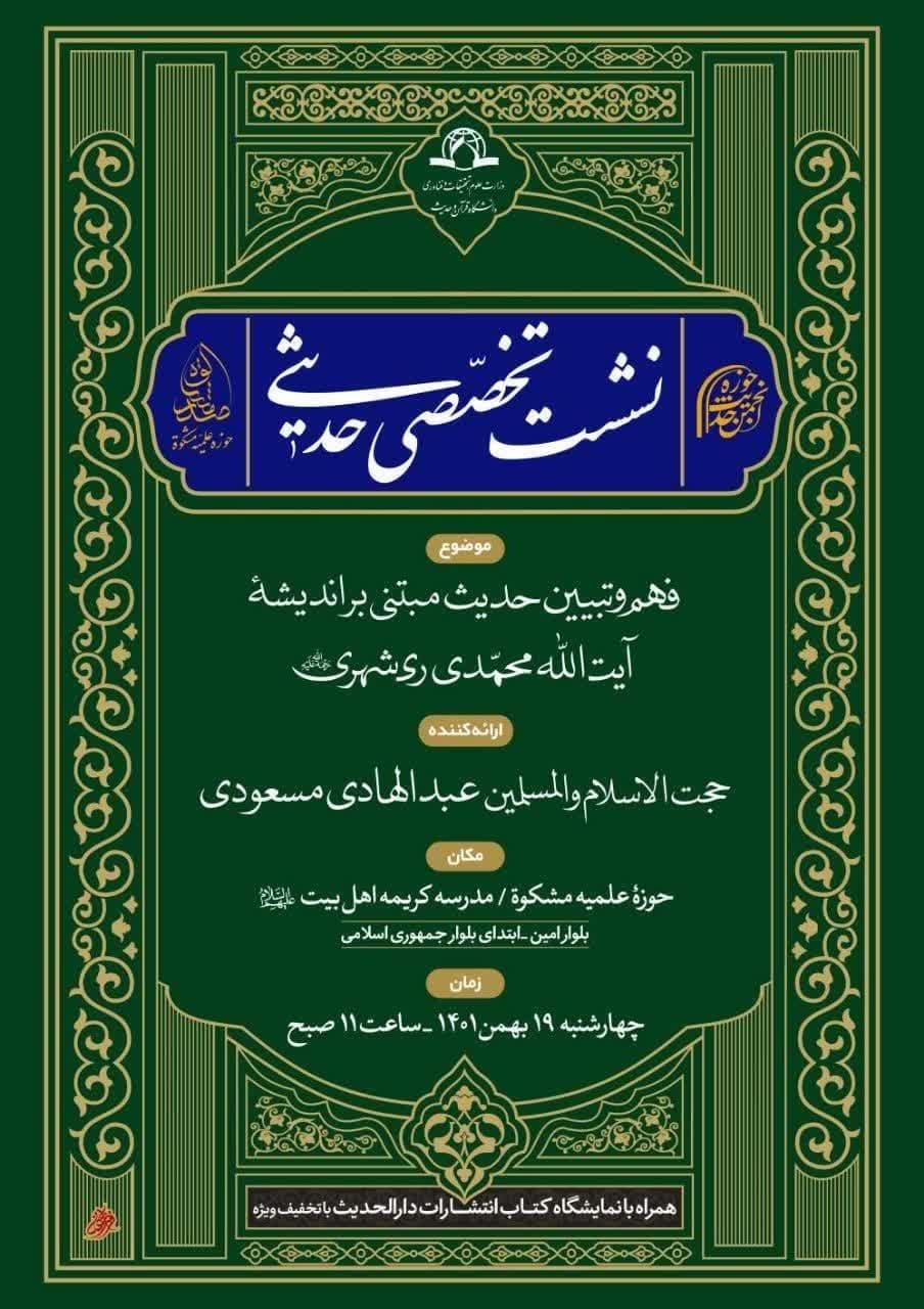 نشست تخصصی حدیثی با عنوان «فهم و تبیین حدیث مبتنی بر اندیشه آیت الله محمدی ری شهری (ره)» برگزار می شود