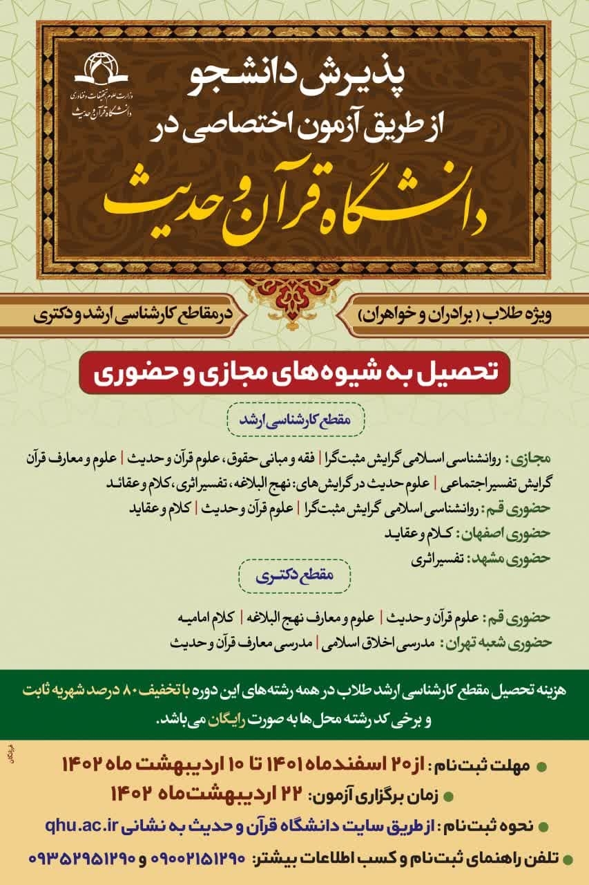 ✅ دانشگاه قرآن و حدیث با مجوز رسمی از وزارت علوم تحقیقات و فناوری و با نظارت سازمان سنجش آموزش کشور از طریق آزمون اختصاصی از میان برادران و خواهران طلبه در مقاطع کارشناسی ارشد و دکتری دانشجو می پذیرد.