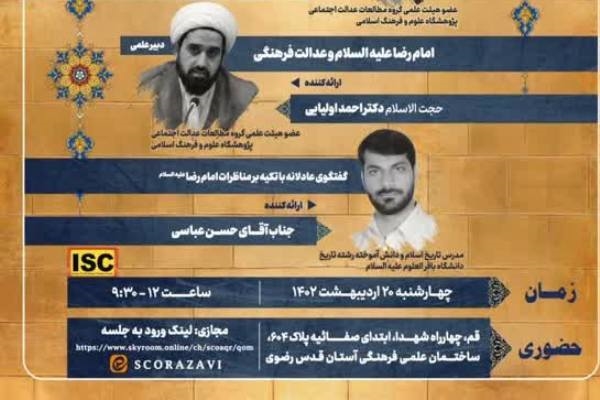 هفتمین پیش نشست پنجمین کنگره جهانی حضرت رضا(ع) با موضوع «عدالت اجتماعی و امام رضا(ع)» روز چهارشنبه ۲۰ اردیبهشتماه از سوی پژوهشگاه علوم و فرهنگ اسلامی برگزار شد.