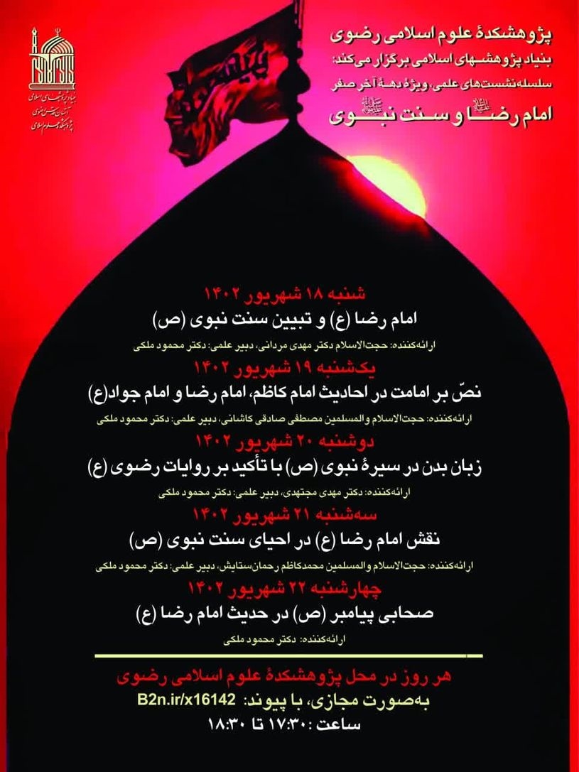 همزمان با ایام دهه آخر صفر بنیاد پژوهشهای اسلامی آستان قدس رضوی، سلسله نشستهای علمی مجازی را با عنوان «امام رضا (ع) و سنت نبوی» برگزار میکند.