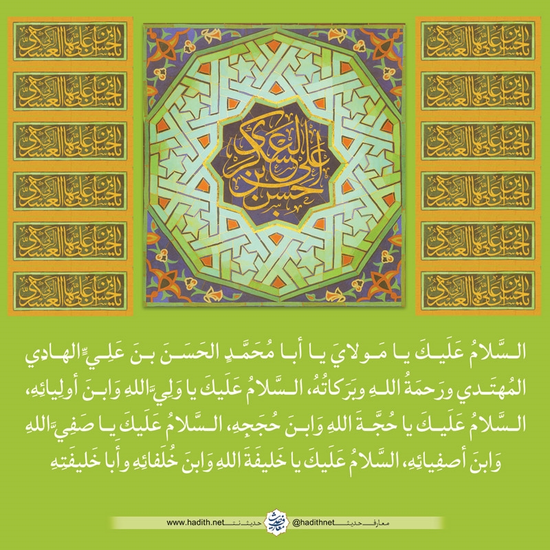 السَّلامُ عَلَيكَ يا مَولايَ يا أبا مُحَمَّدٍ الحَسَنَ بنَ عَلِيٍّ الهادِي المُهتَدي ورَحمَةُ اللهِ وبَرَكاتُهُ، السَّلامُ عَلَيكَ يا وَلِيَّ اللهِ وَابنَ أولِيائِهِ، السَّلامُ عَلَيكَ يا حُجَّةَ اللهِ وَابنَ حُجَجِهِ، السَّلامُ عَلَيكَ يا صَفِيَّ اللهِ وَابنَ أصفِيائِهِ، السَّلامُ عَلَيكَ يا خَليفَةَ اللهِ وَابنَ خُلَفائِهِ وأَبا خَليفَتِهِ، السَّلامُ عَلَيكَ يَابنَ خاتَمِ النَّبِيّينَ، السَّلامُ عَلَيكَ يَابنَ سَيِّدِ الوَصِيّينَ، السَّلامُ عَلَيكَ يَابنَ أميرِ المُؤمنينَ، السَّلامُ عَلَيكَ يَابنَ سَيِّدَةِ نِساءِ العالَمينَ، السَّلامُ عَلَيكَ يَابنَ الأَئِمَّةِ الهادينَ، السَّلامُ عَلَيكَ يَابنَ الأَوصِياءِ الرّاشِدينَ.