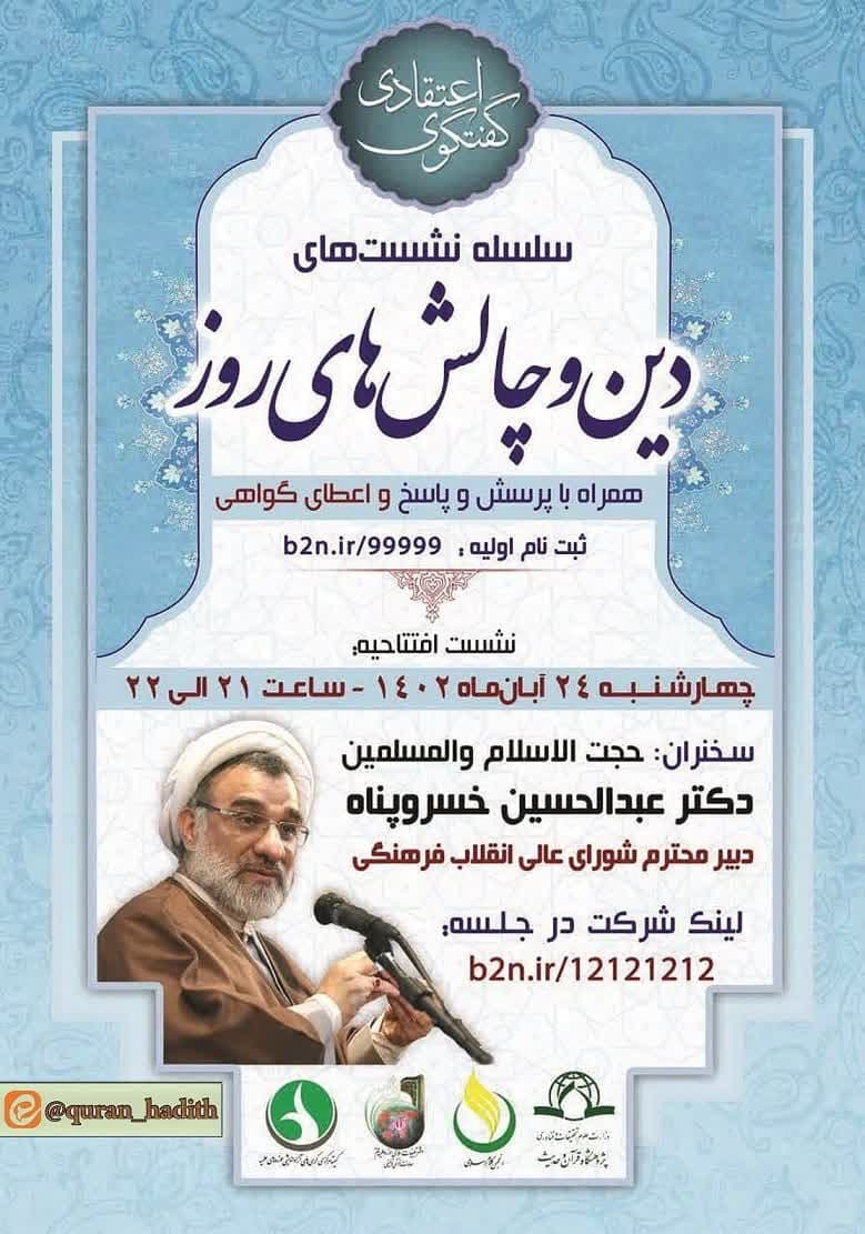 مراسم افتتاحیه برگزاری سلسله جلسات و نشست های "دین و چالش های روز" ویژه "گفتگوی اعتقادی" از سوی پژوهشگاه قرآن و حدیث، انجمن کلام اسلامی حوزه، کمیته مرکزی کرسی های آزاداندیشی حوزه های علمیه و مرکز آموزش های کاربردی دفتر تبلیغات اسلامی قم با ارائه و سخنرانیحجت الاسلام و المسلمین دکتر عبدالحسین خسروپناه، دبیر شورای عالی انقلاب فرهنگی، روز چهارشنبه ۲۴ آبان ماه ۱۴۰۲ از ساعت ۲۱ تا ۲۲ به صورت وبیناری برگزار می شود.