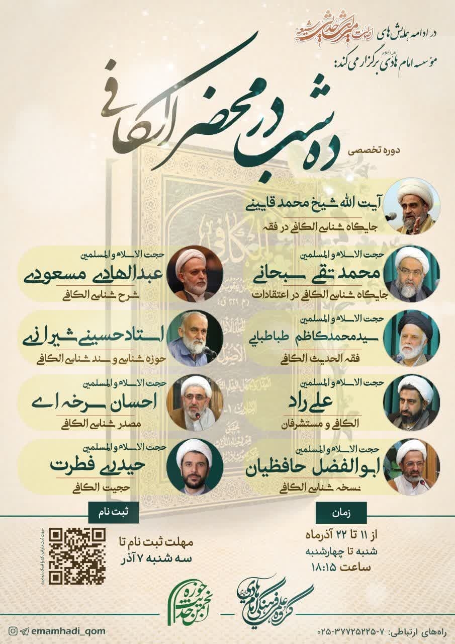 مؤسسه امام هادی «علیه السلام» دوره تخصصی «ده شب در محضر الکافی» برگزار می کند.