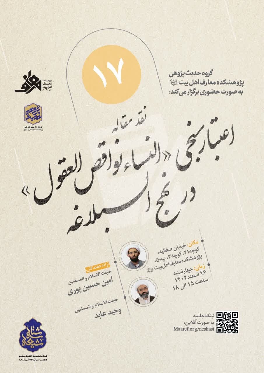 هفدهمین نشست علمی شناسه شیعه با عنوان نقد مقاله «اعتبارسنجی (النساء نواقص العقول) در نهج البلاغه» برگزار می شود.