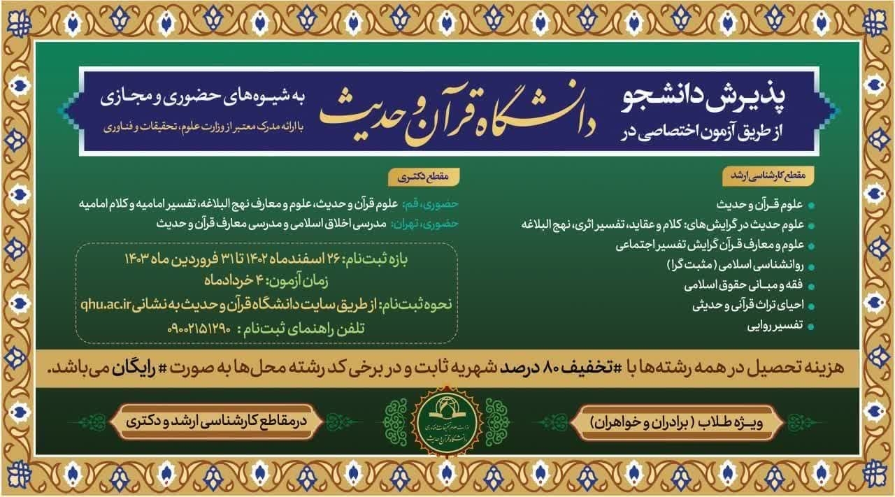 💢دانشگاه قرآن و حدیث وابسته به موسسه دارالحدیث از بین برادران و خواهران طلبه واجد شرایط از طریق آزمون ورودی اختصاصی ویژۀ طلاب، دانشجو می پذیرد.