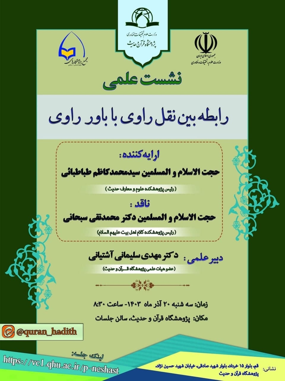 نشانی:قم، بلوار ۱۵ خرداد، بلوار شهید صادقی، خیایان شهید حسین نژاد، پژوهشگاه قرآن و حدیث، طبقه دوم، سالن جلسات