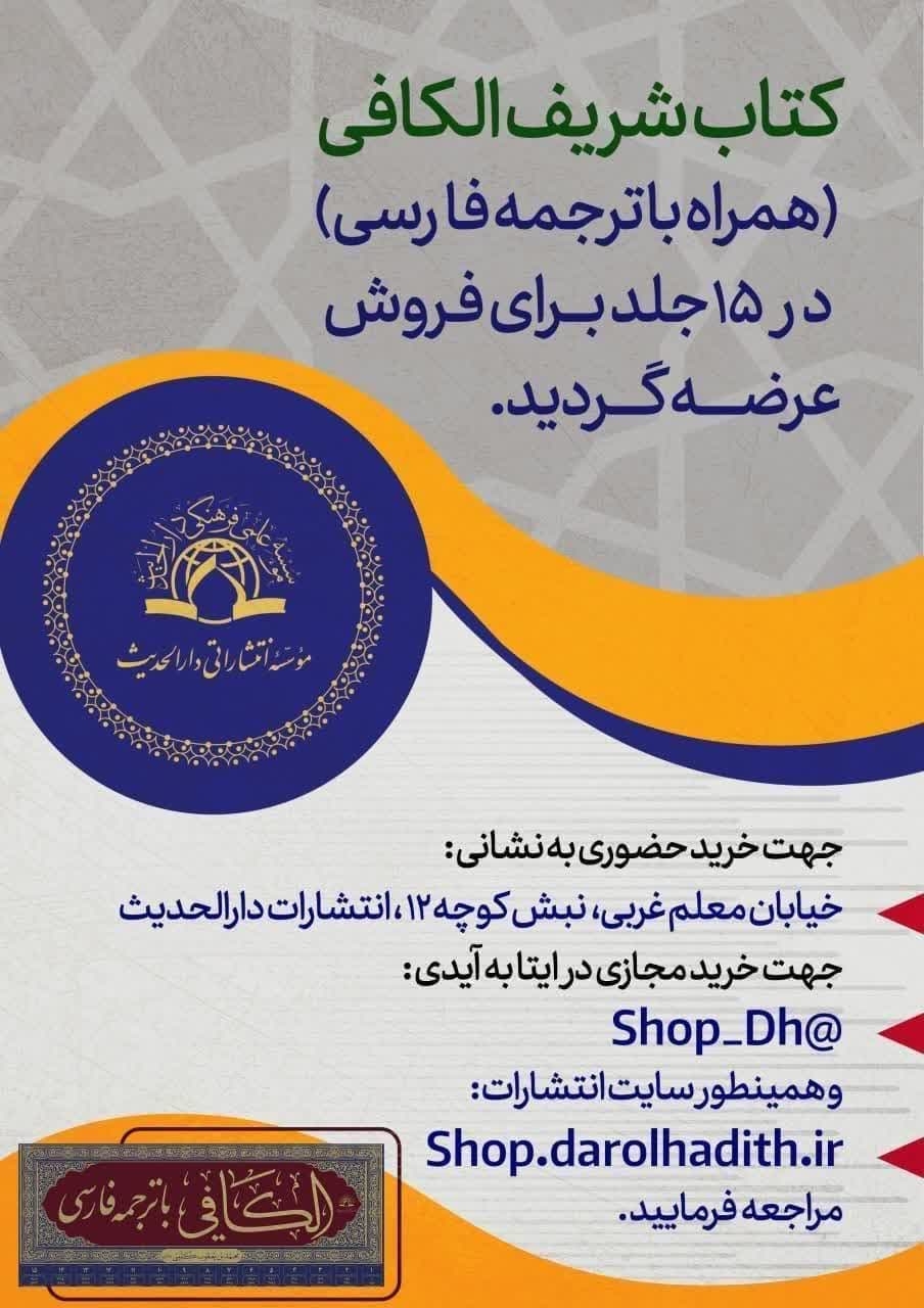 کتاب شریف الکافی (همراه با ترجمه فارسی) در ۱۵ جلد برای فروش عرضه گردید.