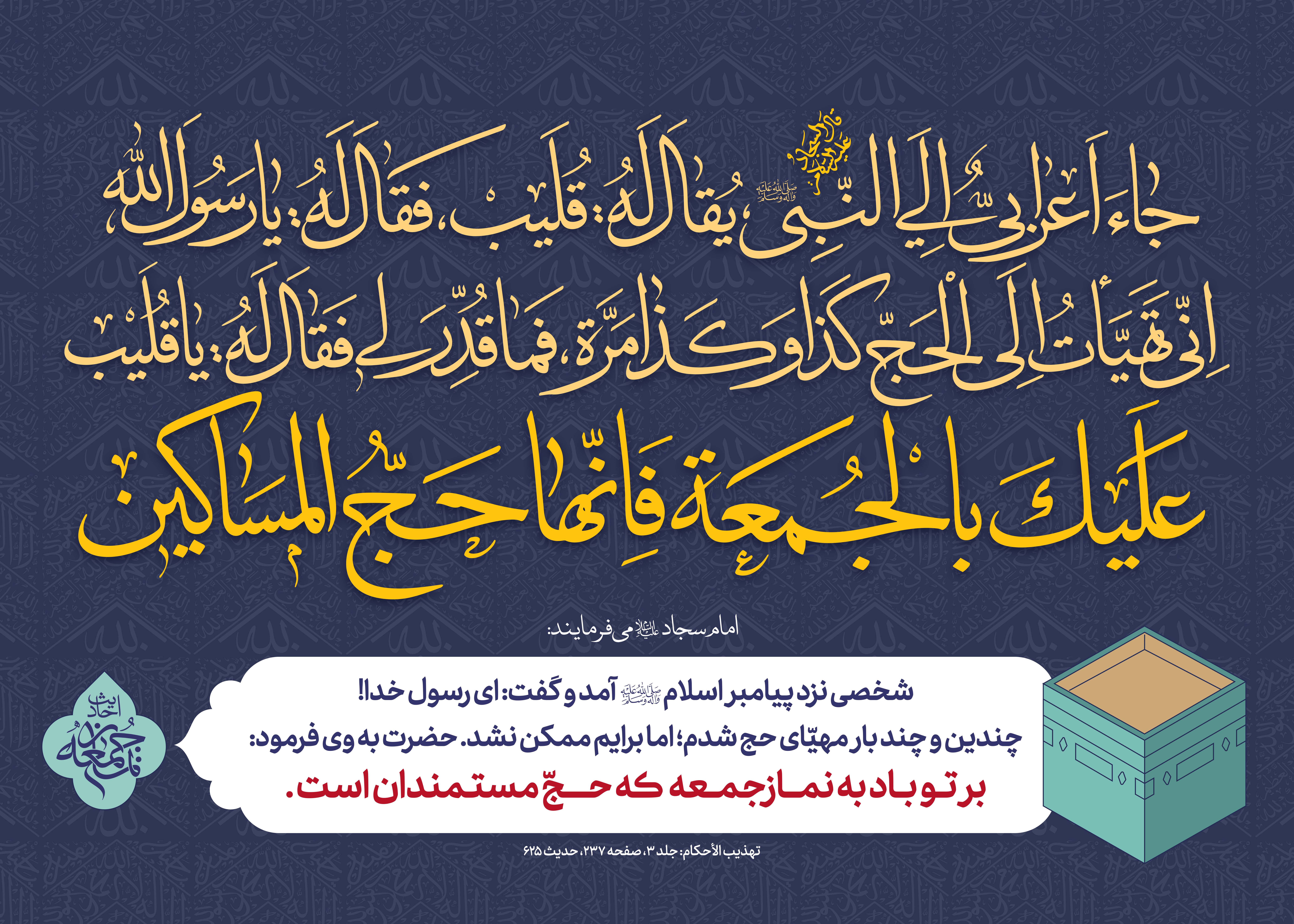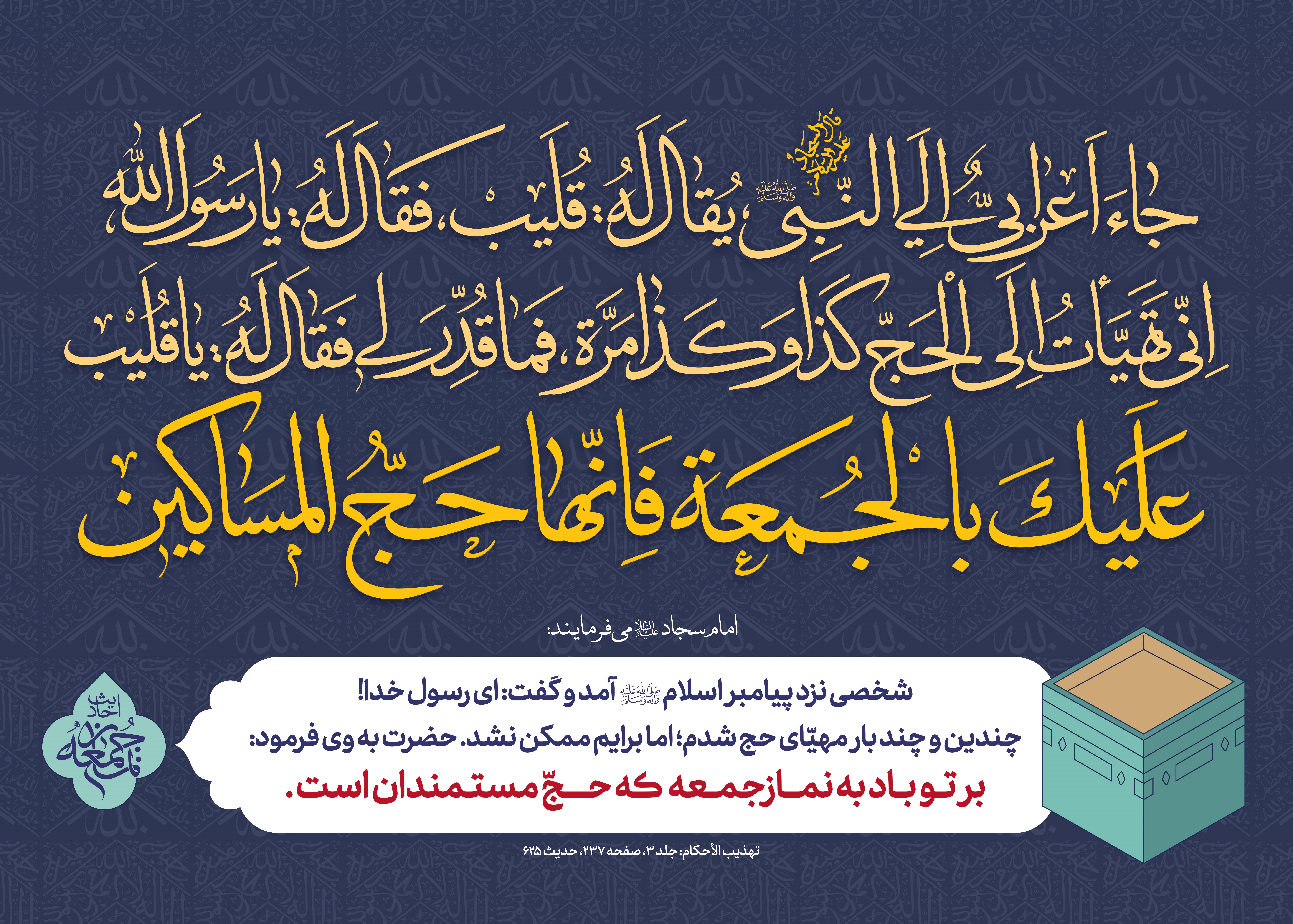 شخصی نزد پیامبر اسلام(صلی الله علیه و آله) آمد و گفت: ای رسول خدا! چندین و چند بار مهیای حج شدم؛ اما برایم ممکن نشد. حضرت به وی فرمود: بر تو باد به نماز جمعه که حج مستمندان است.