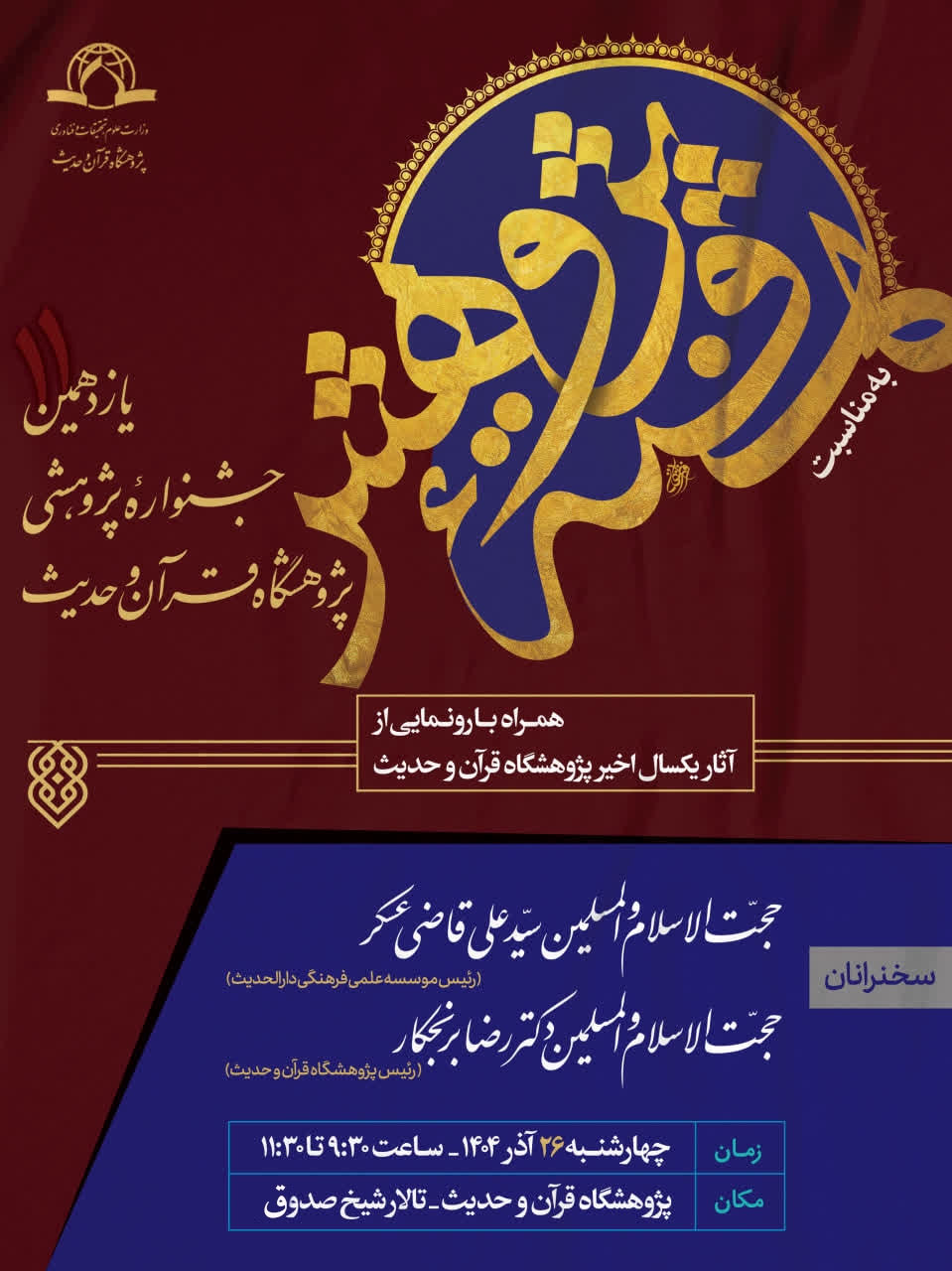 همزمان با هفته پژوهش، یازدهمین جشنواره پژوهشی پژوهشگاه قرآن و حدیث با هدف تجلیل و تقدیر از پژوهشگران برگزیده پژوهشگاه با سخنرانی حجت الاسلام و المسلمین دکتر رضا برنجکار؛ رئیس پژوهشگاه قرآن و حدیث در روز چهار شنبه ۲۶ آذر ۱۴۰۴ از ساعت ۹:۳۰ تا ۱۱:۳۰ در تالار شیخ صدوق (ره) پژوهشگاه برگزار می شود.