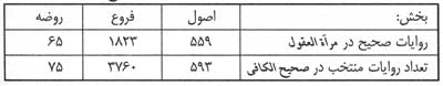 همان گونه كه مشاهده مى شود ، طبق اين آمار ، بيشترين درصد روايات صحيح در فروع و كمترين درصد آن ، در روضه وجود دارد.
