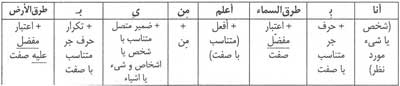 پيش از پرداختن به نمونههاي ديگر در اين زمينه، شايسته است يادآور شويم که ممکن است اين اسلوب با اندک جابجايي در گزارهها، نيز نوشته شود، به اين معني که ميتوان با توجه به متن، بلندي و کوتاهي اجزاء اسلوب، ذوق ادبي و... گاه، بخش حرف جر + اعتبار مفضل صفت که در نماد بالا، پيش از صفت اصلي يا أفعل واقع شده، دقيقاً پس از آن ذکر کرد و ادامه اجزاء را به همان ترتيب ادامه داد، طبق اين شکل: