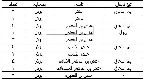 همان گونه که در قبل نیز بازگو شد، «حنش بن المعتمر»،همان «حنش الکنانی» یا «حنش بن المعتمر الکنانی» است. بنا بر این، جدول فوق به صورت زیر خلاصه می شود: