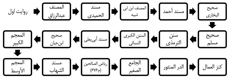 پیش از ورود به بحث لازم است به این نکته اشاره گردد که نمودارهای رسمشده در ذیل احادیث تنها به منظور نشان دادن هر چه بهتر سیر تاریخی نقل روایت بوده و بیانکننده آن نیست که منابع پسین از پیشین روایت را اخذ و نقل نمودهاند.