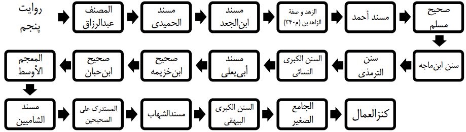 توالی تاریخی، قدمت و اشتهار مصادر روایت پنجم سبب اعتبار آن نزد اهل سنّت شده و بیشتر صاحبان مشهور جوامع حدیثی اهل سنّت آن را گزارش کرد‌ه‌اند: