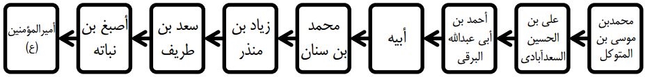 2.. الخصال، ج۱، ص۱۱۳، ح۹۱: «حَدَّثَنَا مُحَمَّدُ بْنُ مُوسَی بْنِ الْمُتَوَکلِ _ رَضِی اللهُ عَنْهُ _ قَالَ: حَدَّثَنَا عَلِی بْنُ الْحُسَینِ السَّعْدَآبَادِی، قَالَ: حَدَّثَنَا أَحْمَدُ بْنُ أَبِی عَبْدِ اللهِ الْبَرْقِی، عَنْ أَبِیهِ، عَنْ مُحَمَّدِ بْنِ سِنَانٍ، عَنْ زِیادِ بْنِ الْمُنْذِرِ، عَنْ سَعْدِ بْنِ طَرِیفٍ، عَنِ الْأَصْبَغِ بْنِ نُبَاتَةَ، قَالَ: قَالَ أَمِیرُ الْمُؤْمِنِینَ ...» .