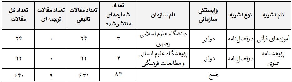 همانطور که در جدول یک ملاحظه میشود، نشریات حوزه علوم قرآن و حدیث به ترتیب تعداد کل مقالاتی که منتشر کردهاند، مرتب شدهاند. در یازده نشریه بررسی شده، در مجموع 640 مقاله در سالهای 1386 - 1390 منتشر شده است. بیشترین تعداد مقالهها، یعنی 180 مقاله در فصلنامه علوم حدیث منتشر شده است. بعد از آن، دو فصلنامه تحقیقات علوم قرآن و حدیث، با انتشار 66 مقاله، و دوفصلنامه مطالعات قرآن و حدیث با 63 مقاله، در رتبههای دوم و سوم قرار گرفتند. دوفصلنامه آموزههای قرآنی با 24 مقاله و دوفصلنامه پژوهشنامه علوی با 22 مقاله، نسبت به سایر نشریهها، مقالههای كمتری در حوزه علوم قرآن و حدیث چاپ كردهاند. همچنین نشریههای دانشگاه علوم اسلامی رضوی، دانشگاه فردوسی مشهد و دانشگاه تهران در طول سالهای بررسی شده، به ترتیب شانزده، سیزده و سیزده شماره منتشر كردهاند. از دوفصلنامه آموزههای قرآنی سیزده شماره آن حذف گردید و سه شماره آن انتخاب شد. دوفصلنامه علوم قرآن و حدیث _ كه پیشتر با عنوان دوفصلنامه مطالعات اسلامی بوده است _ شش شماره آن حذف و هفت شماره آن انتخاب گردید و همچنین از دوفصلنامه پژوهشهای قرآن و حدیث _ كه پیش از این با عنوان فصلنامه مقالات و بررسیها منتشر شده است _ شش شماره از میان سیزده شماره آن حذف گردید و هفت شماره آن بررسی شد. حذف شمارهها به خاطر خارج بودن زمینه موضوعی مقالات آنها از حوزه علوم حدیث بوده است.