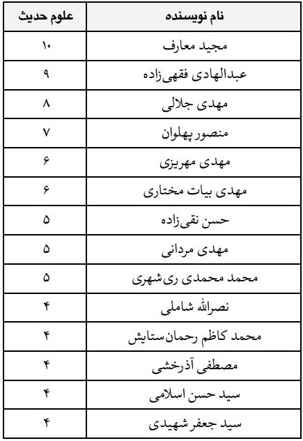 سؤال ششم پژوهش به تعیین نویسندگان پرکار حوزه علوم حدیث تعلق داشت. جدول ۹ نویسندگان پرکار را به همراه تعداد آثار آنها نمایش میدهد.