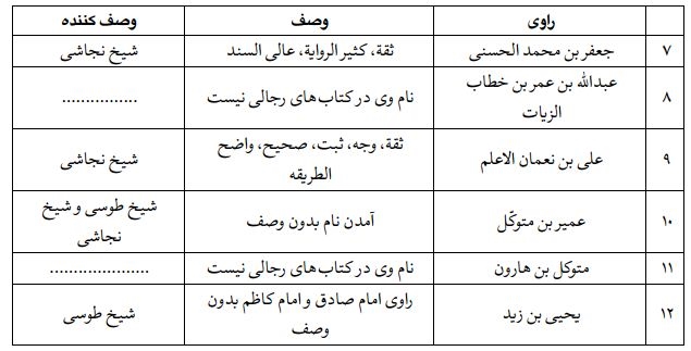 2. ابن سکون حلی، عمید الرؤساء، محمد بن احمد بن شهریار، محمد بن احمد عکبری معدل، جعفر بن محمد الحسنی و علی بن نعمان الاعلم توثیق شدهاند.