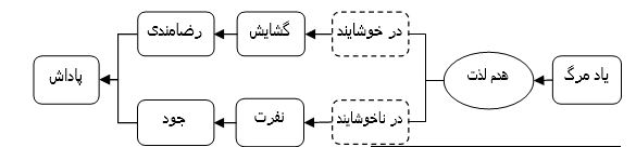 میتوان فهمید که یکی از دلایل واکنش منفی، لذت جویی انسان است. بر این اساس، یاد مرگ از راه تعدیل لذت جویی، تنگنای روانی دوران ناخوشایند را به گشایش روحی و روانی تبدیل میکند و انسان را نسبت به آن راضی میسازد. در دوران خوشایند نیز احساس غنی را منهدم و گشایش روانی را که موجب سرمستی و غرور میشود، تنگ نموده و موجب تعدیل میشود.