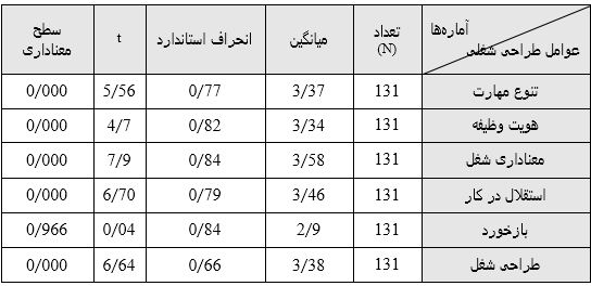 همان گونه که آمارههای جدول شماره یک نشان میدهد، در باره مؤلفههای طراحی شغل کمترین مقدار میانگین (9/2) مربوط به بازخورد و بیشترین مقدار