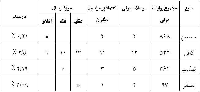 علاوه بر این، ملاحظه جدول پیشین نشان میدهد بیشترین حجم گزارش ارسال در کتاب کافی است که خود بر فرض صحت روایات و صدور مفاهیم آن تنظیم شده است.