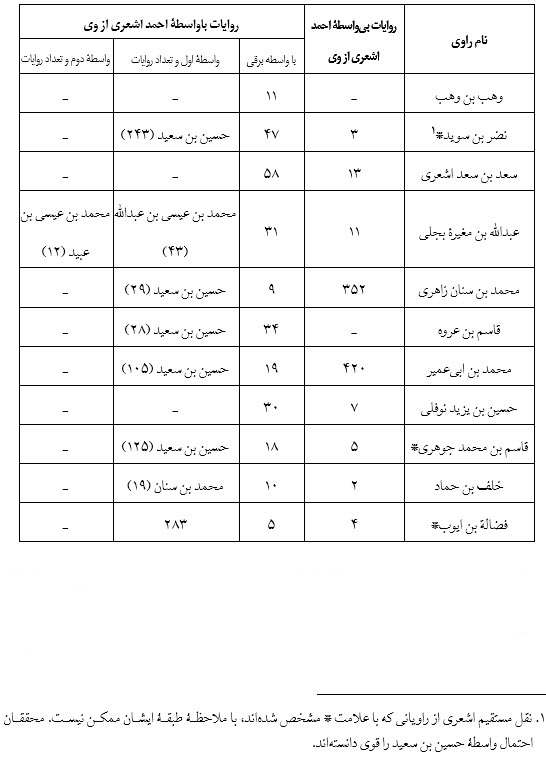 توجه به آمار پیشین و دقت در تراث راویانی همچون قاسم بن عروه و حسین بن یزید نوفلی که کاملاً فقهی است و مقایسه آن با تراث شخصیتی همچون وهب بن وهب نشاندهنده اختلافات عقیدتی میان برقی و جریانی است که احمد اشعری به آن تعلق دارد. این نتیجه در ذهن نگارنده بسیار قوی مینماید که اعتماد شخصیتی همچون احمد اشعری در میراث عقیدتی نیز بر پیروی از خط فقهمداری است که به نقل عقاید نیز میپردازد. این ادعا در بازخوانی احادیث احمد اشعری۱