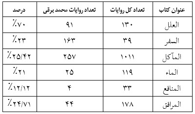 از نقاط شایان توجه در این آمار حجم روایات در کتاب العلل است که میتواند متأثر از این نکته باشد که در زمره تألیفات محمد برقی عنوان کتاب العلل به چشم میخورد.